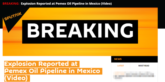 据俄罗斯卫星新闻网消息,墨西哥国家石油公司PEMEX原油管道发生爆炸,发生爆炸的管道位于墨西哥首都墨西哥城西北部的塞拉亚市。墨西哥政府称,爆炸造成至少两人受伤,当前爆炸原因未明,正在进行调查。