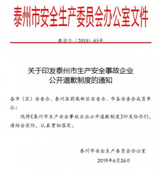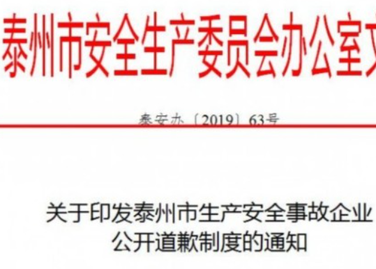 第一条 为进一步落实企业安全生产责任,强化企业主要负责人安全生产主体意识、安全信用意识和社会责任意识,增强事故警示效果,坚决遏制较大及以上事故发生,特制定泰州市生产安全事故企业公开道歉制度。
