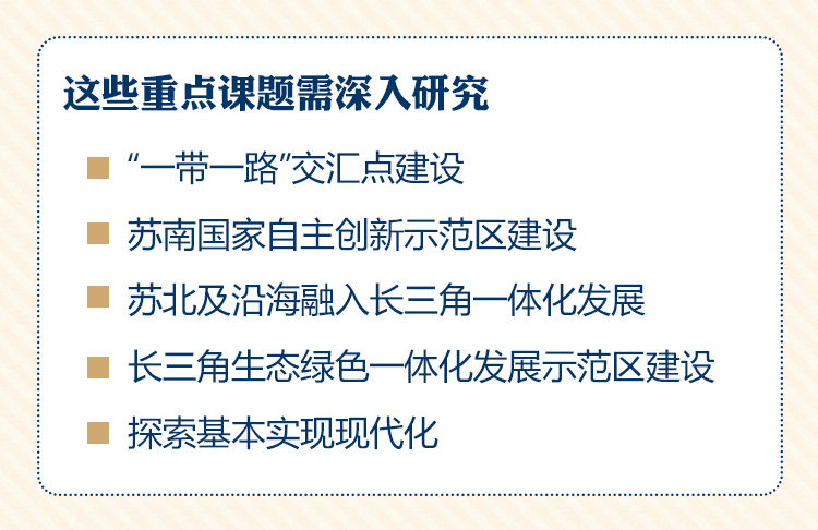 娄勤俭强调,江苏融入长三角一体化,要强化系统性研究,科学确定目标定位,进一步研究动力机制如何建立、边界约束限制有哪些、如何抓住用好机遇等问题。要围绕《规划纲要》落实,重点推进产业创新、基础设施、区域市场、绿色发展、公共服务、内部和边界“六个一体化”,不断提升发展紧密度、协同度、融合度,共同打造全国发展强劲活跃增长极。娄勤俭强调,融入长三角一体化关键是要做好江苏的事情,希望专家学者就“一带一路”交汇点建设、苏南国家自主创新示范区建设、苏北及沿海融入长三角一体化发展、长三角生态绿色一体化发展示范区建设、探索基本实现现代化等重点课题深入研究,助力江苏在长三角区域一体化发展中发挥更大作用。