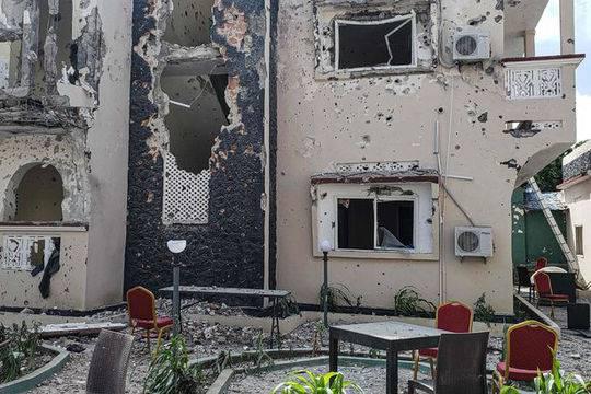 据目击者称,酒店大部分被汽车炸弹爆炸和子弹摧毁。一位目击者表示,“整座建筑都成了废墟,里面有死伤人员,安全部队已经封锁了整个地区。”
