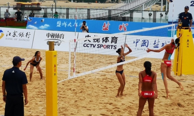我苏网讯 今天(7月18日),为期四天的“2019年全国沙滩排球锦标赛”在盐城大洋湾景区沙滩排球运动基地热辣开赛。来自15个省(市、区)以及香港特别行政区共67支队伍,134名男、女沙排运动健将参赛。