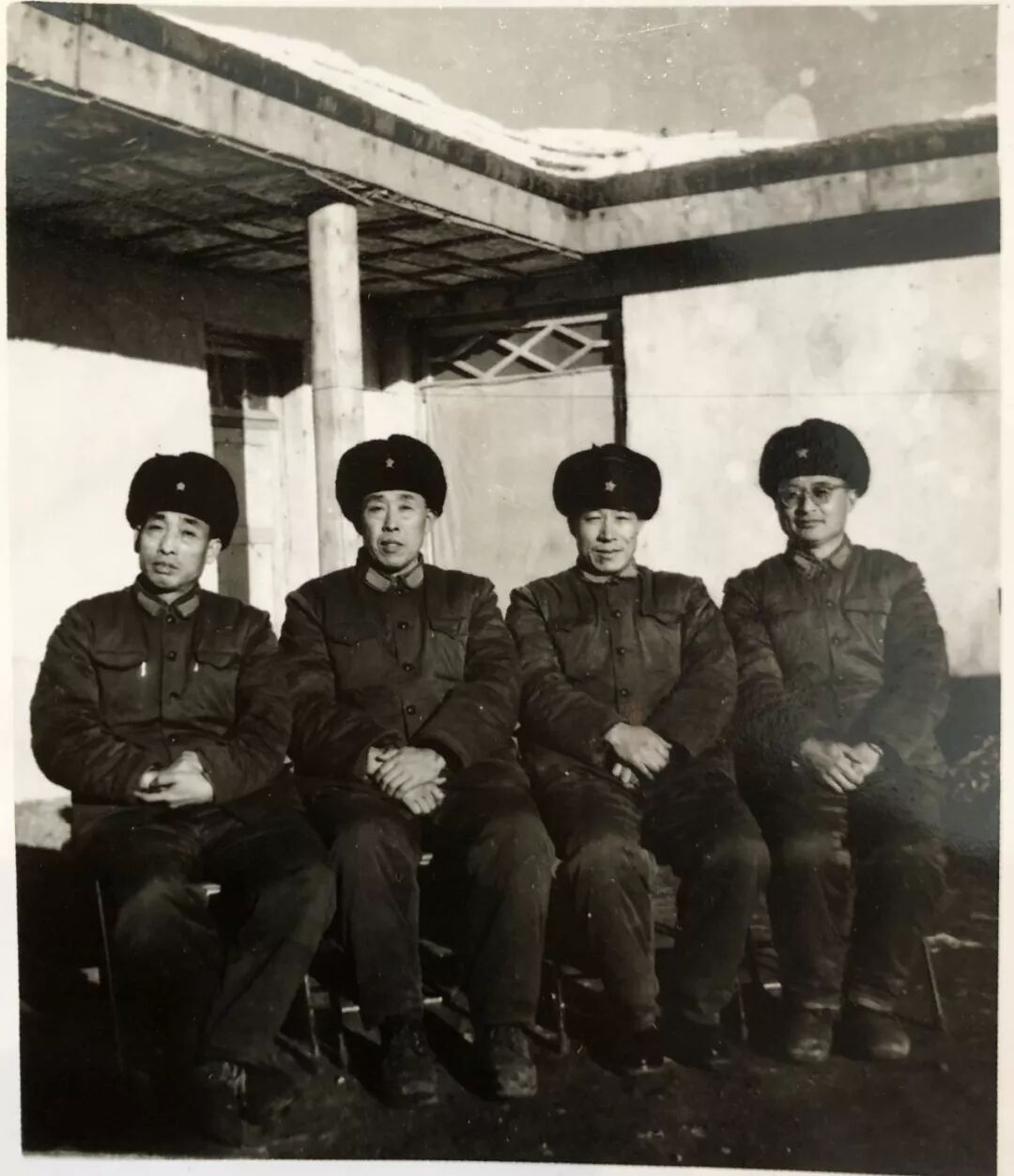 1975年,那拉提团部营房前,赵凤笙(右一)与一六八团团长田万福(右二)、政委董家兰(左二)、副团长王奎宏(左一)合影。