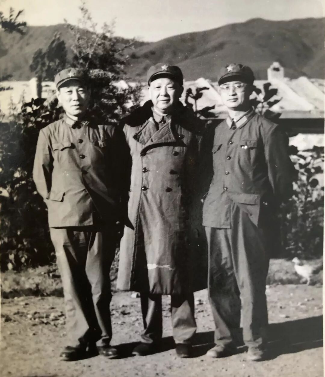 1978年,到部队视察,勘测玉希莫勒盖隧道时,赵凤笙(右一)与一六八团团长田万福(左一)、新疆军区副政委谭友林(中)合影。