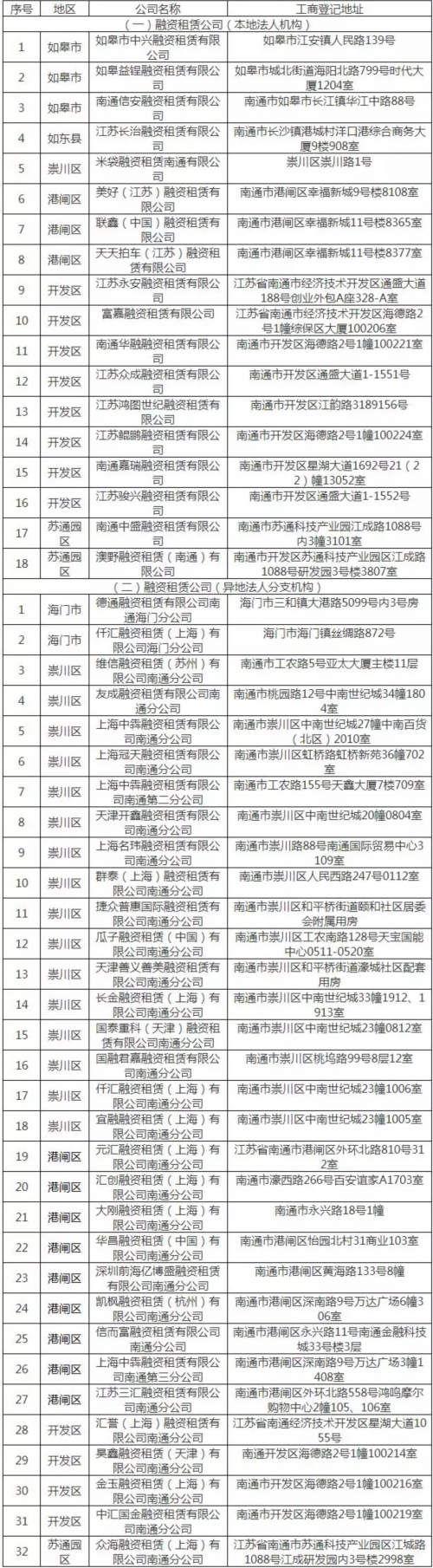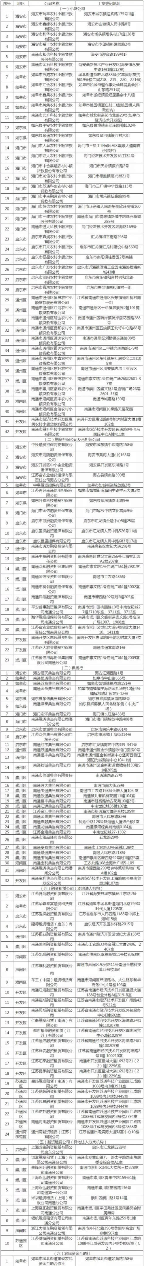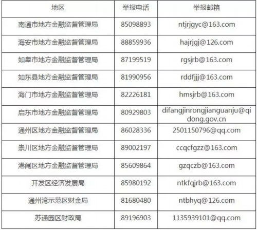 根据《南通市类金融机构监管分类暂行办法》(通金监发[2019]44号)文件要求,南通市地方金融监督管理局自2019年7月份起每月公示区域内类金融机构监管分类动态结果,并于次年1月份公示上年度监管分类最终结果。同时公布各地区监管部门监督举报电话,欢迎广大群众对公示机构存在经营地与注册地不符、违规开展业务、非法吸收公众存款、暴力收贷等违法违规等行为进行举报;对公示机构之外开展小额贷款、融资担保、典当、融资租赁等经营业务的非持牌机构进行举报。