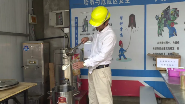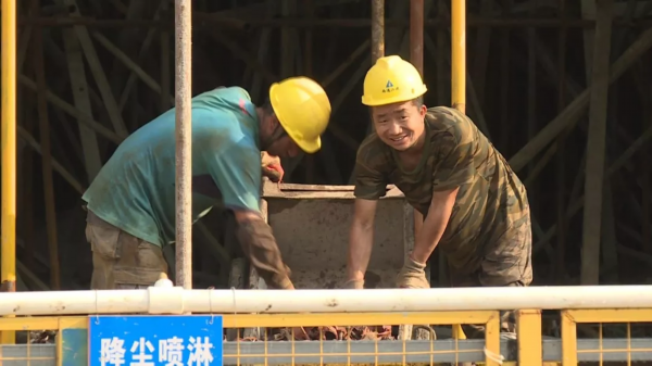 江苏南通六建项目经理陈书兵说:“在37度以上的高温天气,我们会全面停止室外施工,日常会给工人们提供绿豆汤、大麦茶、冰块、防暑药品等。”