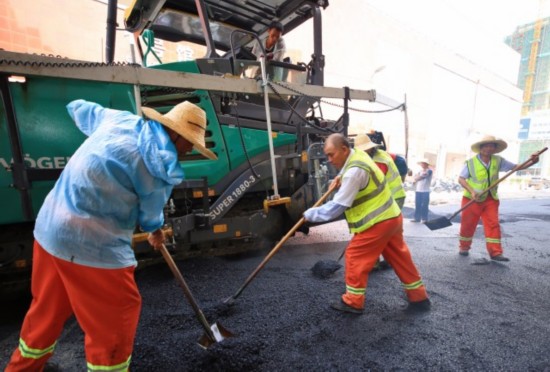 工人摊铺沥青作业