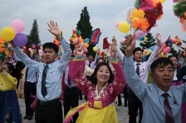 △欢迎人群身着节日盛装,在锦绣山太阳宫广场呈方阵排列。锦绣山太阳宫是金日成生前长期工作和生活的地方,金日成和金正日的遗体均安放于此。(央视记者王哈男拍摄)
