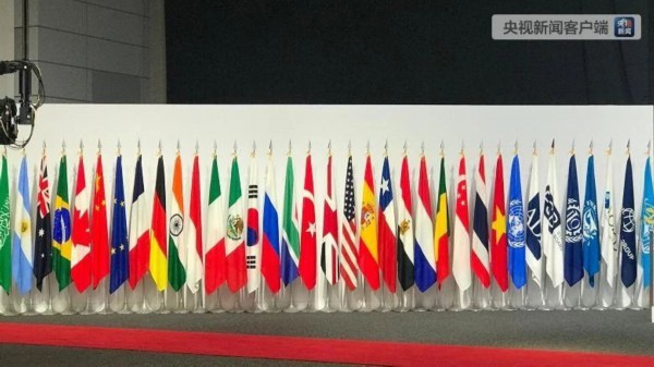△G20大阪峰会与会各方的旗阵。(央视记者石伟明拍摄)