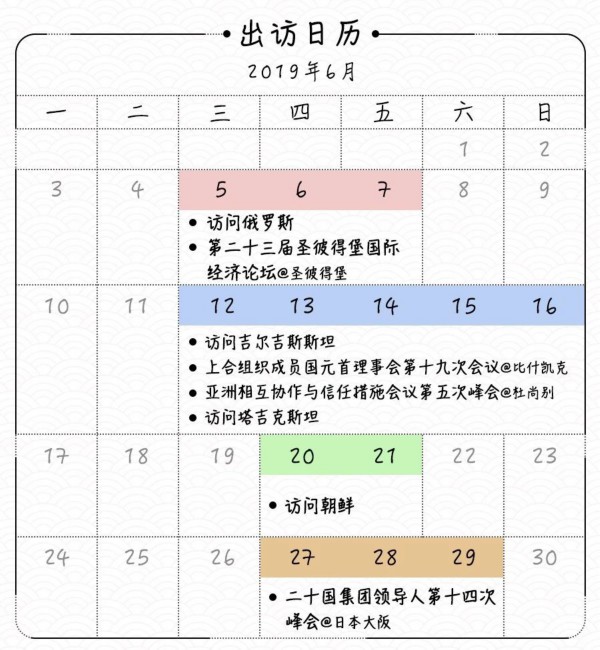 忙碌的六月,习主席几乎“一周一访”,先后到访俄罗斯、吉尔吉斯斯坦、塔吉克斯坦、朝鲜和日本这五个国家,参加多场重要国际会议,密集出席约90场双多边活动。最高领导人一个月内连续四次出访,创造了新中国外交史上的新纪录。