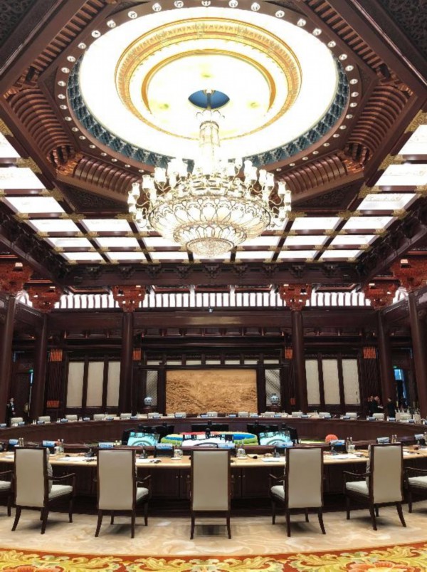 △雁栖湖国际会议中心集贤厅的大圆桌。圆桌会议是指一种平等、对话的协商会议形式。为避免席位主次之别、表示参加各方地位平等,与会各方围圆桌而坐。(央视记者马亚阳拍摄)