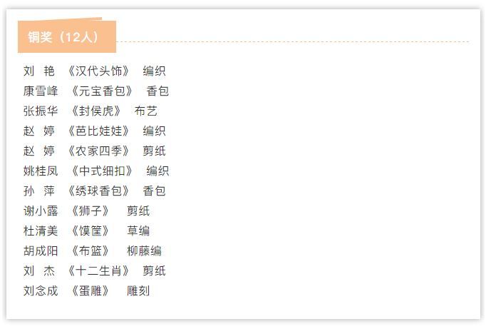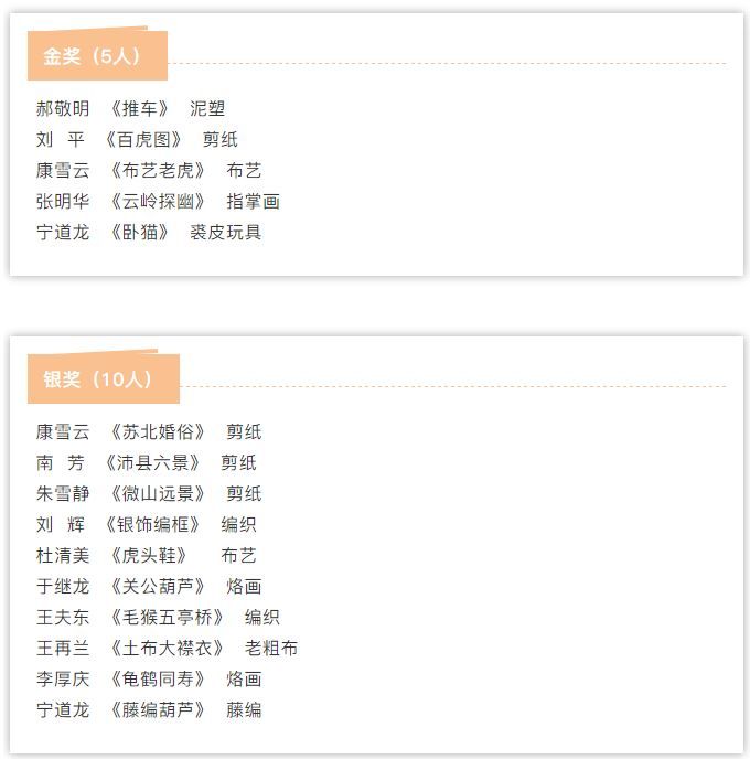 经各镇文体站推荐、个人报名,共有来自全县各行各业的50余名民间手工艺人和手工爱好者参加此次活动,征集参赛作品240件(套)。经综合评审,最终确定泥塑作品《推车》等5个作品获金奖,剪纸作品《苏北婚俗》等10个作品获银奖,编织作品《汉代头饰》等12个作品获铜奖。