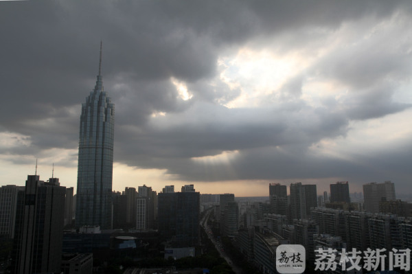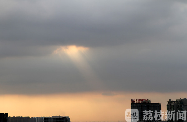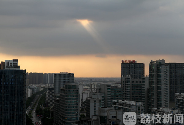 8月5日17时许,常州市区上空出现“天眼”天象。夕阳从漫天乌云稀薄处洞穿,洒下道道金光,犹如天公开眼,在地标建筑高楼的映衬下蔚为壮观。