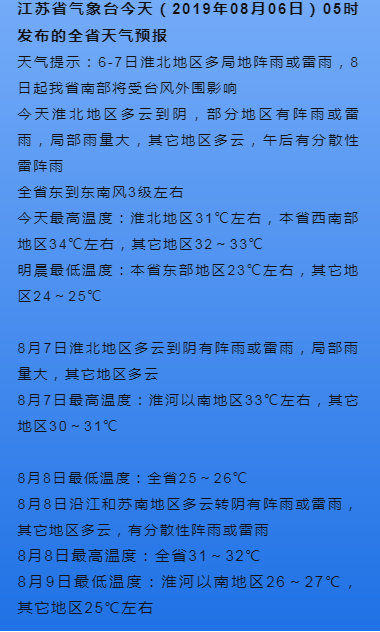 【8日起台风影响】今天淮北地区多云到阴,部分地区有阵雨或雷雨,局部雨量大,其它地区多云,午后有分散性雷阵雨,全省东到东南风3级左右,今天最高温度:淮北地区31℃左右,本省西南部地区34℃左右,其它地区32~33℃,明晨最低温度:本省东部地区23℃左右,其它地区24~25℃。