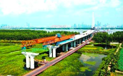 随着长江五桥主桥索塔封顶,一排排桥墩从江面向湿地公园延伸开来,正在加紧进行桥面安装,预计2020年4月主桥贯通,年底建成通车。