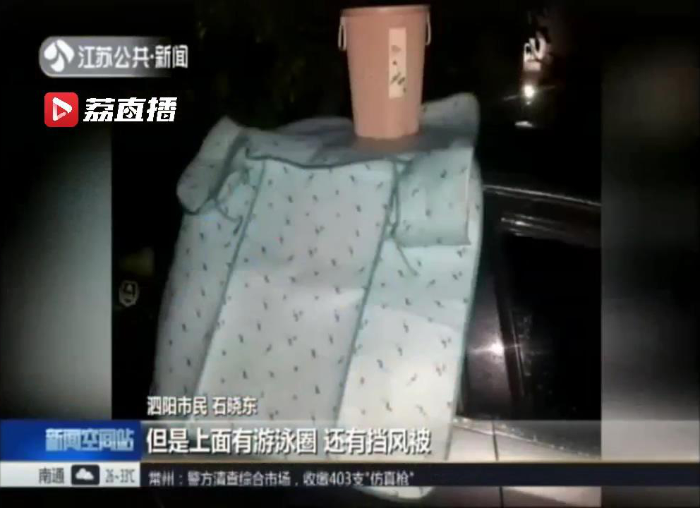 石晓东看到车子后窗上面有游泳圈,还有挡风被。可能为了防止挡风被被风刮走,还用垃圾桶压着。石晓东觉得非常暖心,真正体会到远亲不如近邻。