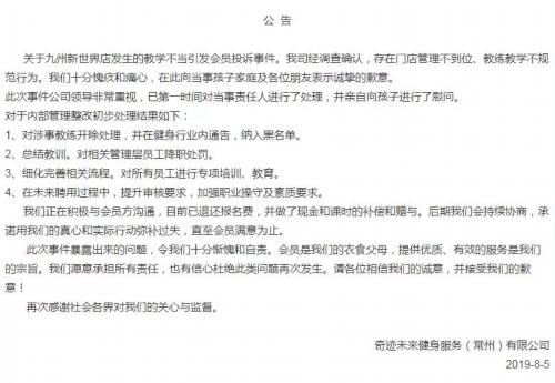 奇迹健身兰陵店发出公告回应