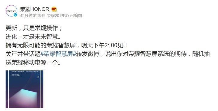 此外,荣耀官方微博今天也放出了倒计时海报,称荣耀智慧屏将于明天下午14:00正式亮相,并且海报上的“不断进行的系统,蕴藏无限可能”也引人遐想。