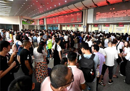 △2019年8月10日,福州火车站售票大厅内,旅客排队等候办理退票、改签等手续