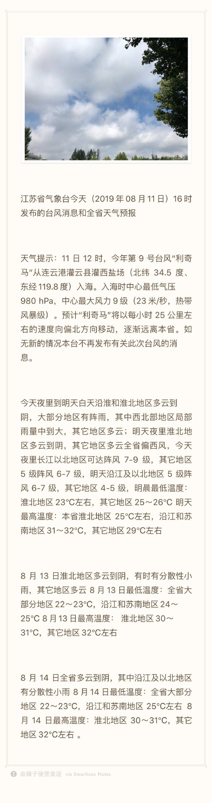我苏网讯 随着台风“利奇马”远离江苏,目前全省各地基本告别了暴雨天气,风力也明显减小。今天傍晚7时左右,江苏各地气温都在30℃以下,非常凉爽舒适。不过,我省北部地区的徐州仍在台风影响范围内,今夜仍有大风降水;其他地区虽然台风已经远离,但是今天夜里风力仍较大,小编在此还是要提醒大家注意防范。