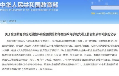8月23日,教育部发布通知,对2019年全国教育系统先进集体、全国模范教师和全国教育系统先进工作者,2019年全国优秀教师、全国优秀教育工作者拟表彰对象进行公示。