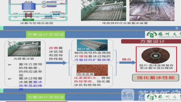 彭权说,获奖项目的原理就是将泡沫金属与蓄冰管表面翅片有效结合,大幅度强化了蓄冰区的有效导热能力。主要采用冰蓄冷空调来调节建筑物白天和夜间电力的平衡性,从而达到节约用电的效果。