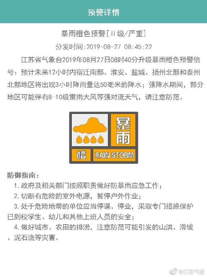 早上08时40分,江苏省气象台升级暴雨橙色预警信号:预计未来12小时内宿迁南部、淮安、盐城、扬州北部和泰州北部地区将出现3小时降雨量达50毫米的降水;强降水期间,部分地区可能伴有8-10级雷雨大风等强对流天气,请注意防范。
