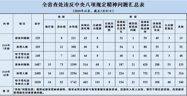2019年7月,全省共查处违反中央八项规定精神问题229起,处理319人,其中给予党纪政务处分248人。从处理干部级别看,查处县处级干部11人、乡科级及以下干部308人。从查处问题类型看,违规发放津补贴或福利问题最为突出,有59起;其次是违规配备使用公务用车和违规收送礼品礼金问题,分别为51起、49起。这3类问题占到查处问题总数的69.4%。