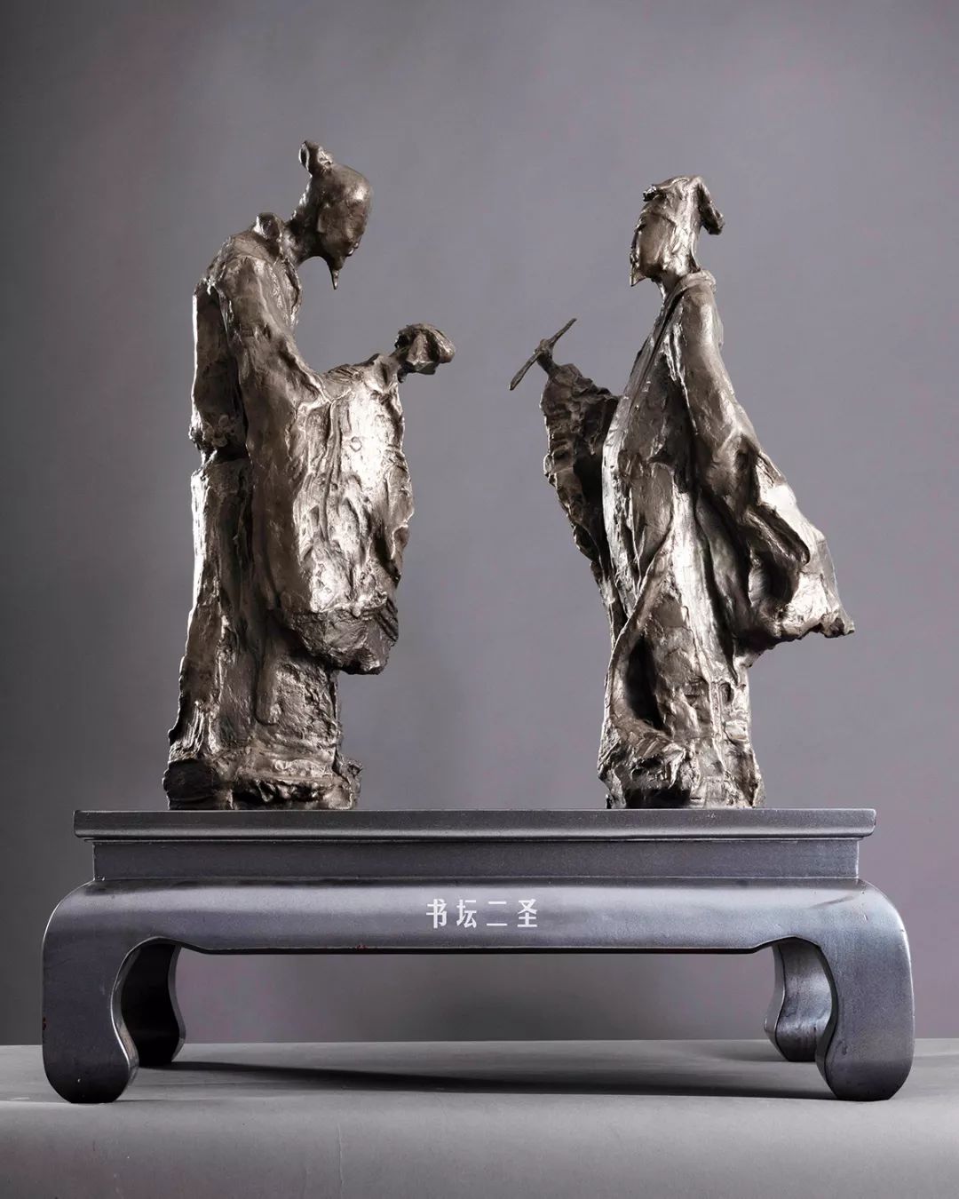 雕塑作品《书坛二圣》材质为青铜着色,以传统文化之书法先贤典故“義之爱鹅”、“张旭脱帽”为创作素材,用写意技法进行创作,是跨时空的传承与对话,体现传统文化的包容性,表现书以载道的精神,两个人物着色青灰石色、造型动态呼应,加之传统木底座,整体形似一座山石盘景,喻示文化基石长青。