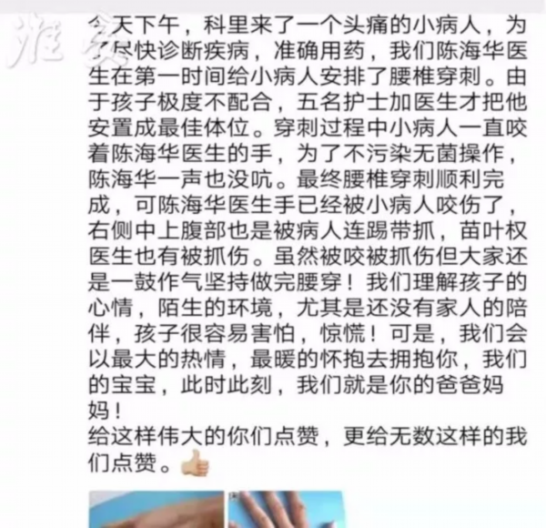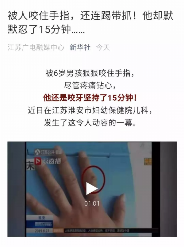 近日,一名6岁的小患者在淮安市妇幼保健院儿科接受治疗时,因为过分焦虑,狠狠咬住了医生陈海华的手指,尽管疼痛钻心,但他并没有制止孩子,一直忍了15分钟。