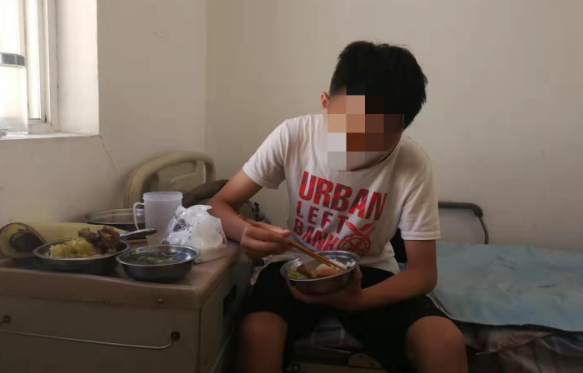 几个月后,石金龙的病情有所好转。7月初,刚刚初中毕业的儿子石晓宇从连云港来到南京照料父亲。因为没有住处,只能每天睡在父亲床位旁的地板上。