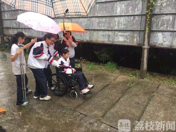 “快上来,我们送你进教室。”当姚诗雯的父母将女儿送到甘泉中学门口时,两名女生就已经推着轮椅在校门口候着了,每天“爱的接力”在甘泉中学展开。