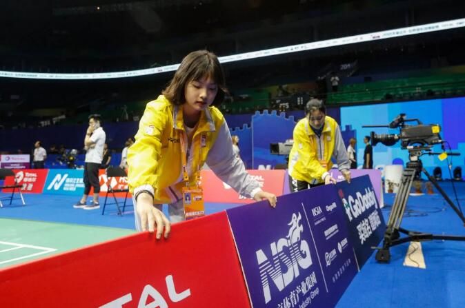 2018羽毛球世锦赛上,志愿者“小青柠”们正利用比赛间隙整理赛场围挡。