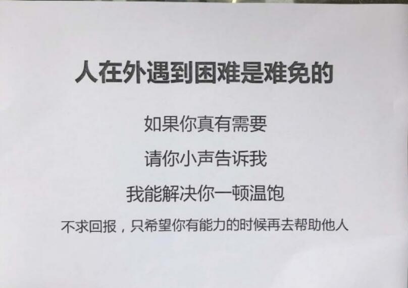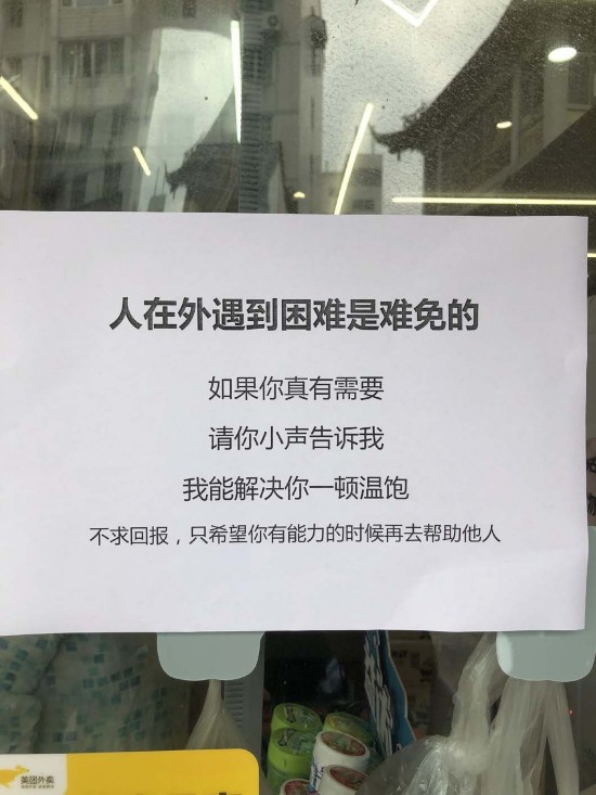 “人在外遇到困难是难免的,如果你真有需要,请你小声告诉我,我能解决你一顿温饱。不求回报,只希望你有能力的时候再去帮助他人。”这家超市门前醒目位置张贴的小纸条,引起了不少行人的关注。有附近居民用手机将之拍下,发在社区微信群和朋友圈,收获了一片点赞声。不少网友留言,要来这家店一探究竟,看看小纸条上的内容是不是真的。