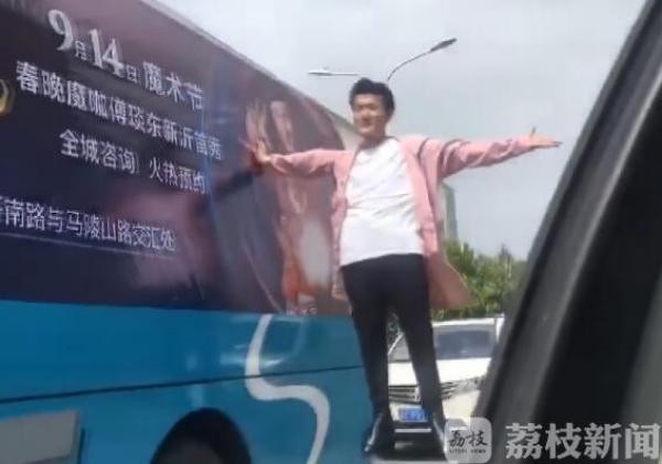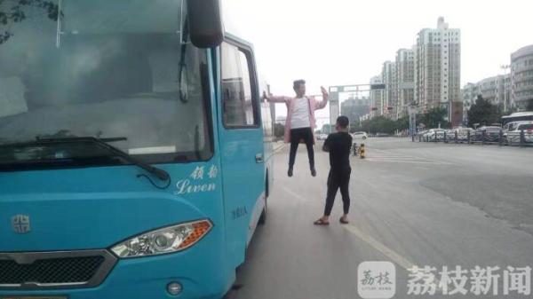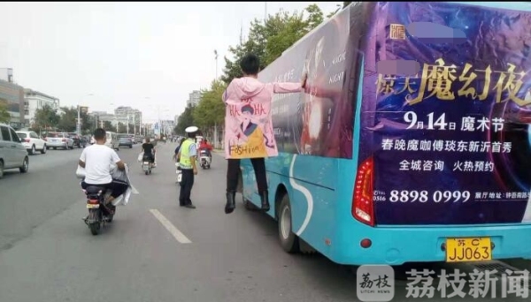 近日,在徐州新沂街头有一辆大巴车外悬挂着一名男子,车辆穿梭在车流当中十分危险。有市民拍下视频后向新沂交警举报,交警及时将该车辆截停。