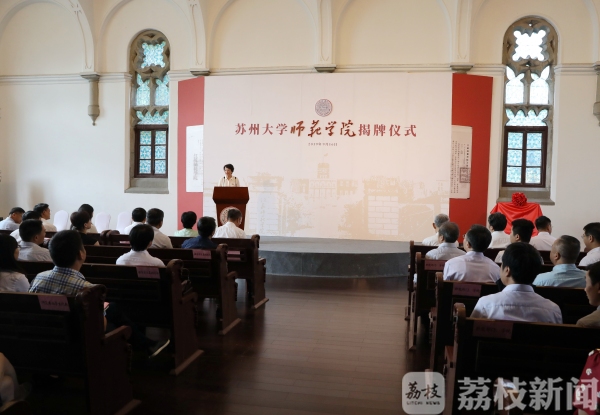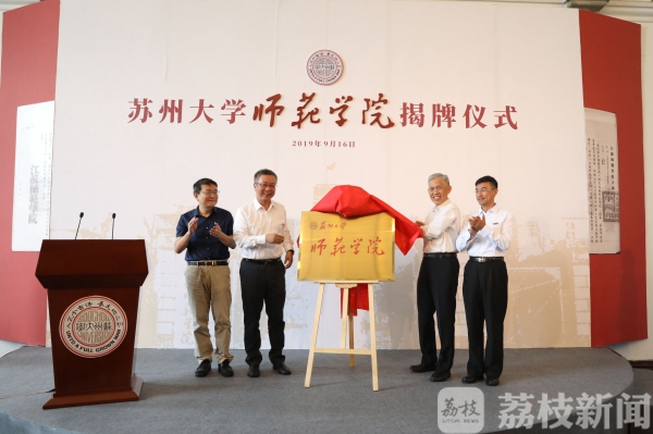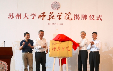 9月16日上午,苏州大学师范学院揭牌仪式在苏州大学钟楼礼堂举行。教育部教师工作司司长任友群、香港田家炳基金会董事局主席田庆先、江苏省教育厅副厅长顾月华等领导和嘉宾参加仪式。铭牌上“师范学院”四个字样取自原江苏师范学院校名,意为不忘初心,传承弘扬江苏师范学院精神,培育优秀师范人才。