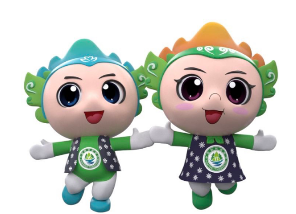 吉祥物是一对充分融入了南通元素的可爱娃娃。在色调上,以蓝绿为主,契合了节庆活动绿色、生态的主题;在服饰上,采用了南通的国家级非遗蓝印花布图案,并加入了南通市树广玉兰、南通市花菊花和江海浪花等元素。