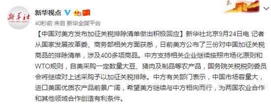 记者从国家发展改革委、商务部相关方面获悉,日前美方公布了三份对中国加征关税商品的排除清单,涉及400多项商品。中方支持相关企业继续按照市场化原则和WTO规则,自美采购一定数量大豆、猪肉及制品等农产品,国务院关税税则委员会将继续对上述采购予以加征关税排除。中方有关部门表示,中国市场容量大,进口美国优质农产品前景广阔,希望美方继续与中方相向而行,为两国农业合作和其他领域合作创造有利条件。