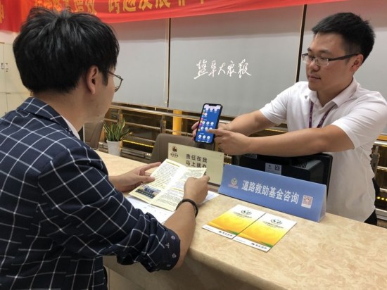△图为紫金保险工作人员正在向市民宣传手机申请道路救助基金。