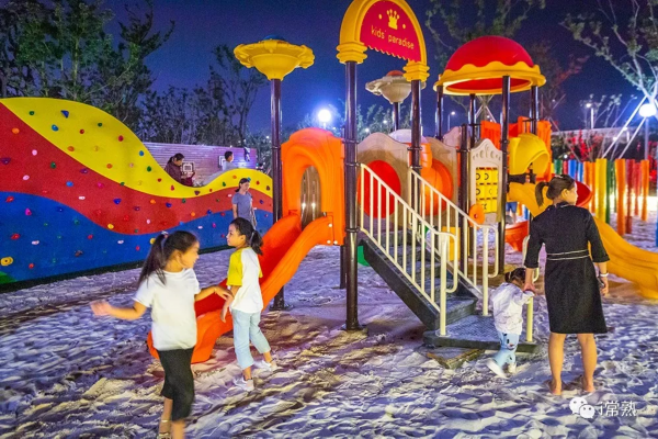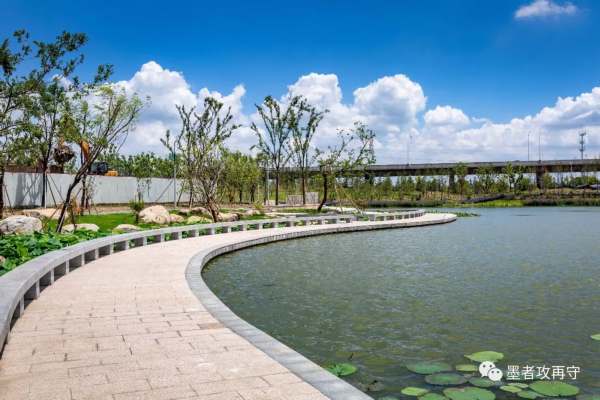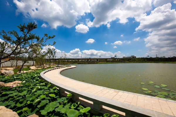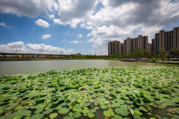 以水花园和湖景区的风貌为特色,辅以滨水休闲、儿童娱乐、文化展示等功能,建设有儿童活动场地,包含儿童攀岩墙、沙坑区、木桩区、儿童篮球场等设施,另设有景观平台、花岛等错落有致的景点。