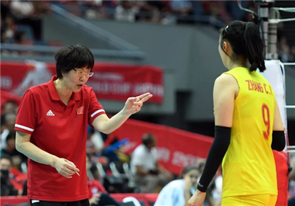 9月28日,中国队主教练郎平(左)在比赛间隙指导张常宁。新华社记者 贺灿铃 摄