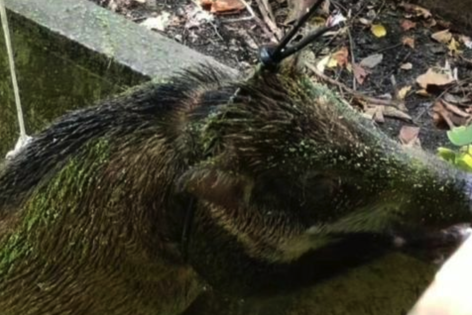 民警赶到现场,只见工厂水池内有一头长约1.5米,全身棕黑,嘴部长有獠牙的野猪,正在水池里悠闲地“泡澡”。市民猜测,这头野猪可能是附近山上的,因为天气闷热下山来避暑休闲的。