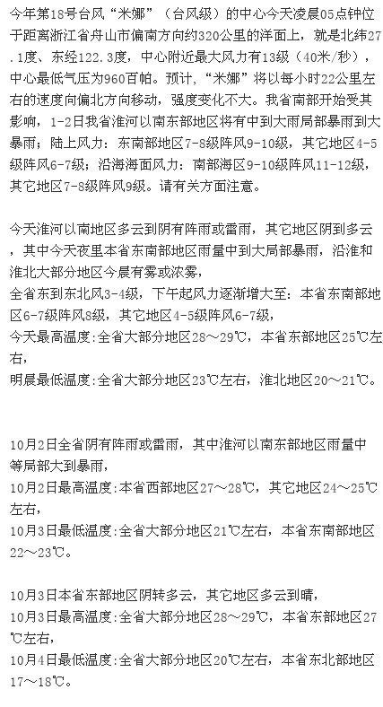 据江苏气象消息,今天淮河以南地区多云到阴有阵雨或雷雨,其它地区阴到多云,其中今天夜里本省东南部地区雨量中到大局部暴雨,沿淮和淮北大部分地区今晨有雾或浓雾,全省东到东北风3-4级,下午起风力逐渐增大至:本省东南部地区6-7级阵风8级,其它地区4-5级阵风6-7级,今天最高温度:全省大部分地区28~29℃,本省东部地区25℃左右,明晨最低温度:全省大部分地区23℃左右,淮北地区20~21℃。