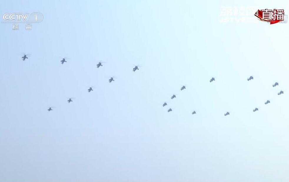 空中护旗梯队拉开了阅兵分列式的序幕,中国共产党党旗、中华人民共和国国旗、中国人民解放军军旗飘扬在天安门广场上空。20架直升机组成巨大的“70”字样。(文字:新华视点)
