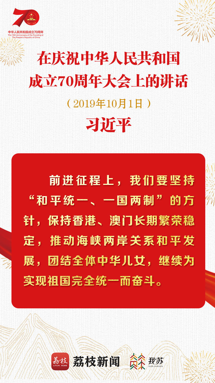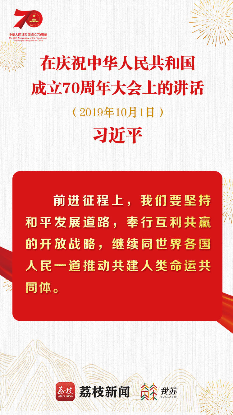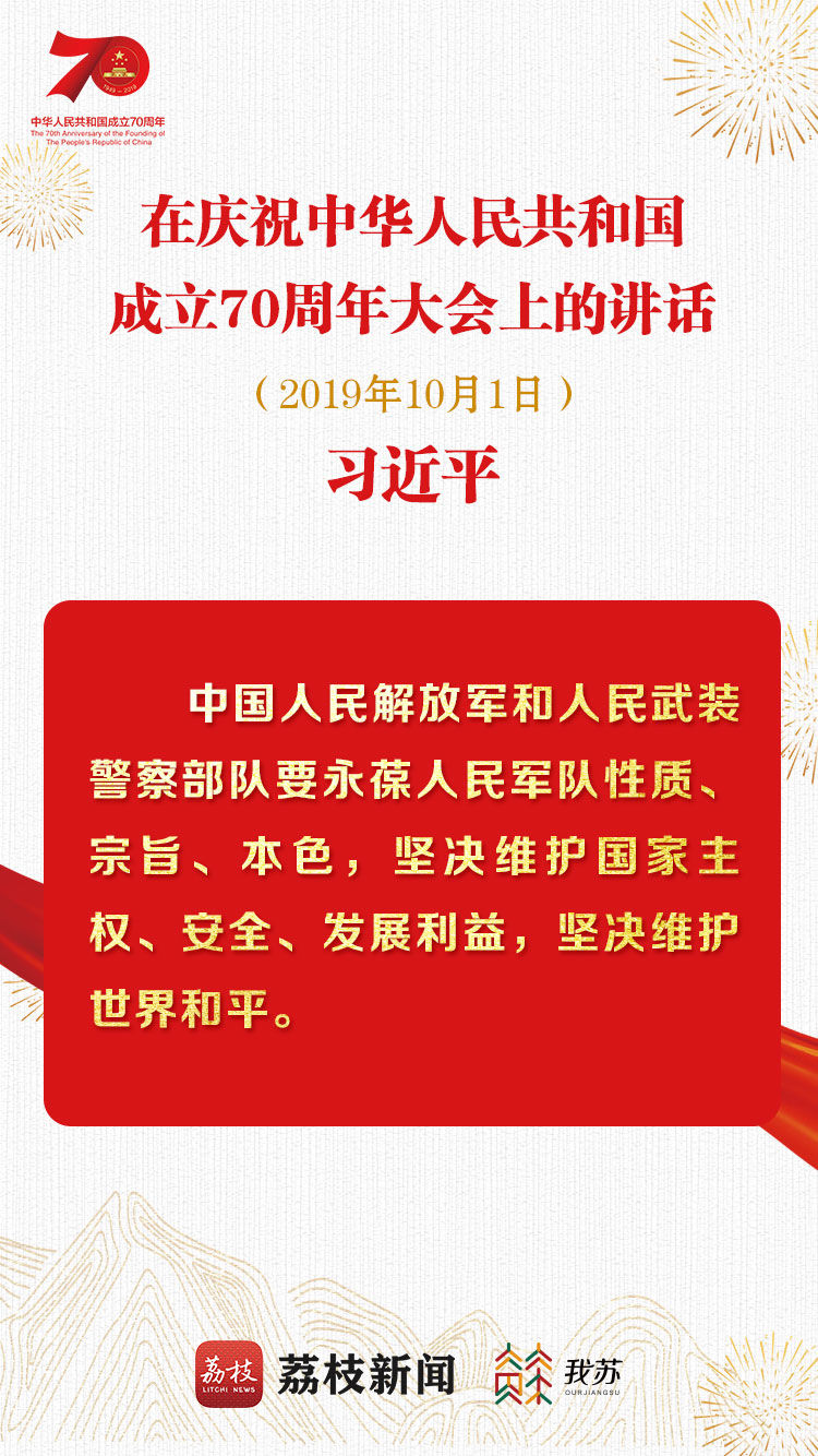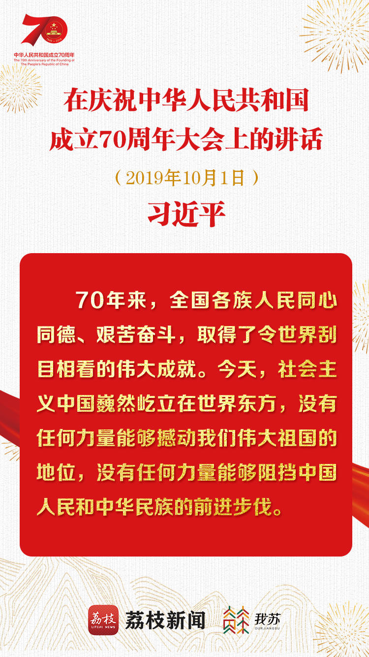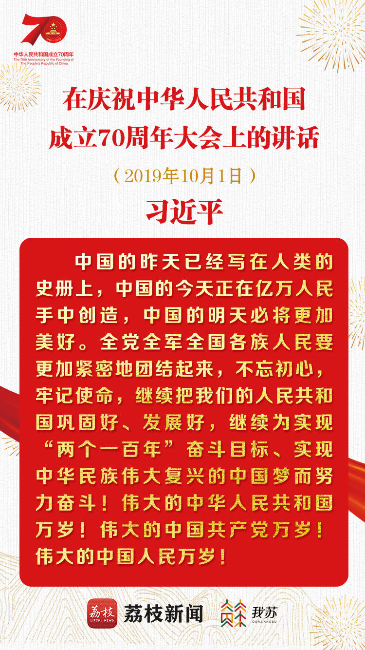 荔枝新闻讯 10月1日上午,庆祝中华人民共和国成立70周年大会在北京天安门广场隆重举行。中共中央总书记、国家主席、中央军委主席习近平发表重要讲话。