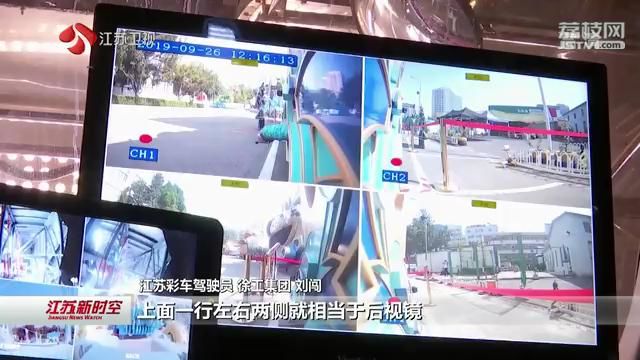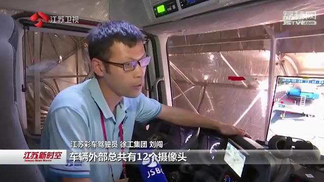 江苏彩车驾驶员、徐工集团刘闯说,车辆外部总共有12个摄像头反馈到驾驶舱内,显示器可以看到车辆正前方、正后方、左右两侧的补盲角情况;上面一行左右两侧就相当于后视镜,还有一个副驾驶来辅助主驾驶来行驶。