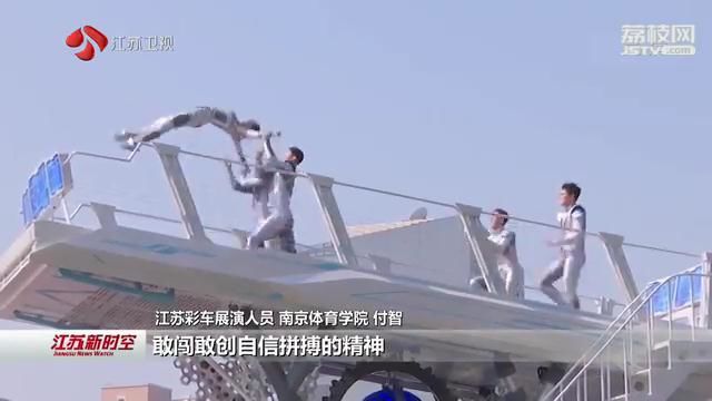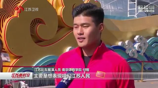 江苏彩车展演人员、南京体育学院付智说,演出的内容主要是想表现江苏人民敢闯敢创自信拼搏的精神。