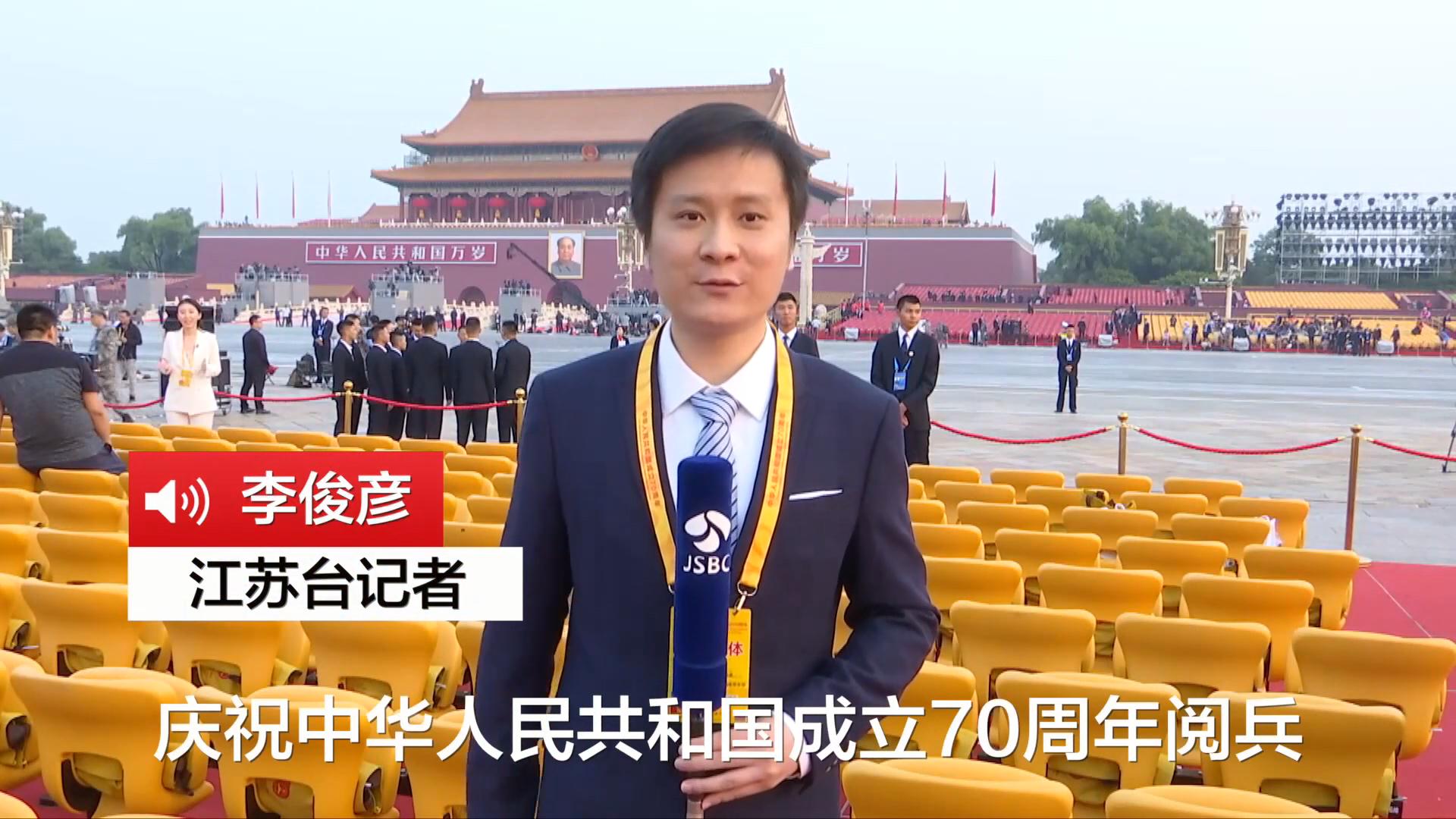 江苏台记者李俊彦在天安门广场的东临观礼台直击阅兵盛况!庆祝中华人民共和国成立70周年阅兵式一共有1.5万人参与,共有59个方队参加,是近几次阅兵中规模最大的一次。