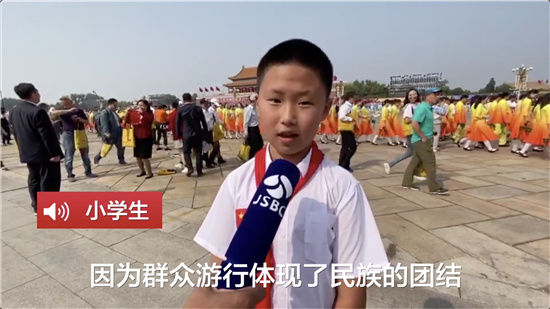 小学生:印象最深刻的是最后的群众游行,因为群众游行体现了民族的团结,体现了中华人民共和国的科技发展,也体现了中华人民共和国在世界的地位。