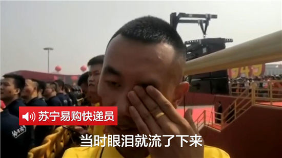苏宁易购快递员:现场太震撼人心了,当时眼泪就流了。我当兵时的梦想就是能够参加阅兵式,现在退役了但是能够现场参加,非常激动,也是圆了自己的梦想。