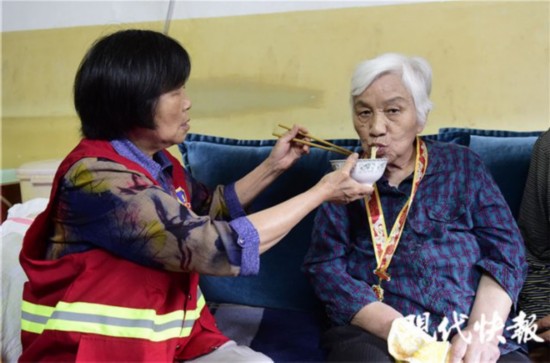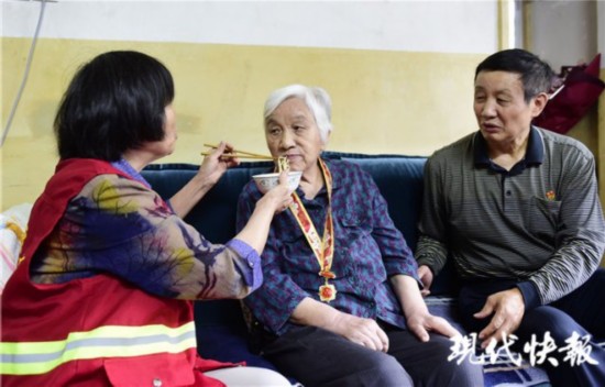 午饭时间到了,志愿者现场为周忠秀煮面。考虑到老人牙口不好,志愿者特意煮得时间长一点,让面条烂一点,方便老人入口,还配上了鸡汤。由于周忠秀老人身体不好,再加上不久前还大病一场,因此如今需要喂食。吃着面条,老人很是开心,连称“谢谢你们”。负责照顾老人的保姆曹秀英告诉记者,大病初愈后老人不怎么能说话。“今天你们来了,她高兴,说的还多一些呢。”